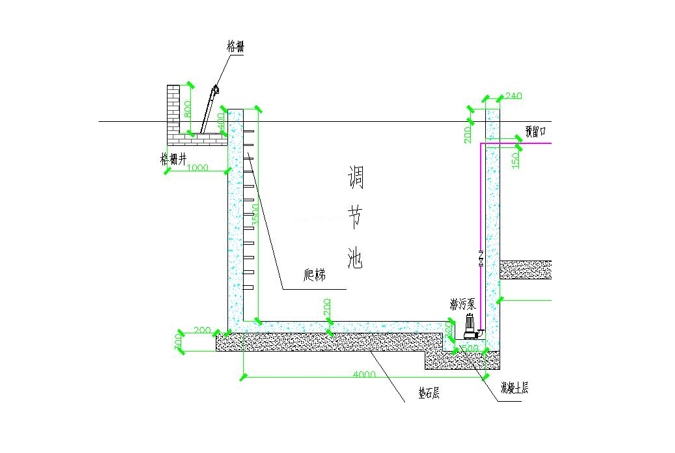 用于調(diào)節(jié)水量和均勻水質(zhì),使污水能比較均勻進入后續(xù)處理單元。調(diào)節(jié)池內(nèi)設(shè)置預(yù)曝氣系統(tǒng),可提高整個系統(tǒng)的抗沖擊性,及減少污水在厭氧狀態(tài)下的惡臭味,同時可減少后續(xù)處理單元的設(shè)計規(guī)模,污水池內(nèi)設(shè)置潛污泵,用以將污水提升送至后續(xù)處理單元。