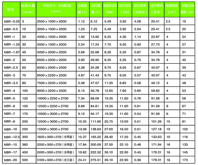 1、下表是根據(jù)mbr工藝做的一體化污水處理設(shè)備型號的設(shè)置,本表格中包含著設(shè)備型號,處理水量,設(shè)備的外型尺寸,設(shè)備重量,運(yùn)行重量,總裝機(jī)濾,運(yùn)行功率,運(yùn)行費(fèi)用,占地面積等的具體描述。