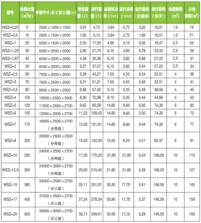 2、下表是WSZ型一體化污水處理設(shè)備型號表格,從本表格中可以明確的看出那個型號的設(shè)備對應(yīng)的處理水量是多少?客戶可以有目的的選擇設(shè)備型號;