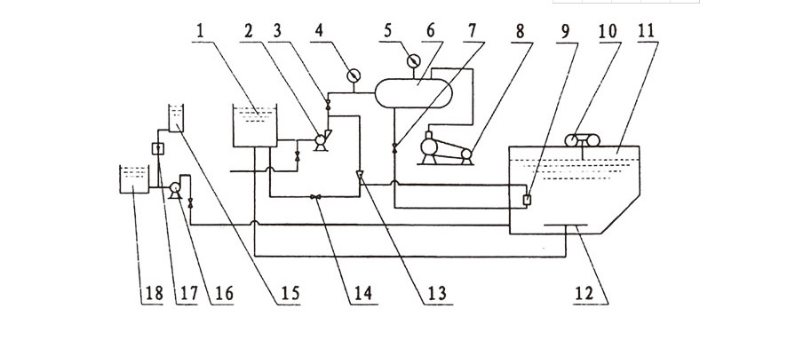 經(jīng)加藥反應(yīng)后的污水進(jìn)入氣浮機(jī)的混合區(qū)。與釋放后的溶氣水混合接觸,使絮體粘附在細(xì)微氣泡上,然后進(jìn)入氣浮區(qū),絮凝體在氣浮力的作用下浮向水面形成浮渣,下層的清水經(jīng)集水器流至清水池后,一部分回流作溶氣水使用,剩余清水通過(guò)溢流口流出。氣浮池水面上的浮渣聚集到一定厚度以后,由刮沫機(jī)刮入氣浮機(jī)污泥池后排出。
