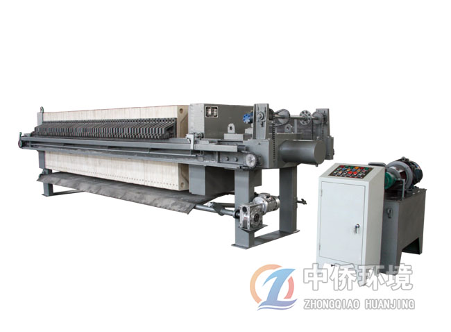 啟動電機(jī),通過減速機(jī)帶動絲桿轉(zhuǎn)動推動頭板移動,壓緊濾板,然后用鎖緊螺母鎖緊。用泵將帶過濾的懸浮液輸送至已壓緊的各個濾室中,懸浮液中的液體透過濾布,通過各濾板上的濾液孔排至機(jī)外,懸浮液中的固體顆粒積聚于濾室中,逐漸形成濾餅,濾餅充滿濾室,即完成一個過濾循環(huán)。如使用雙隔膜濾板,可在進(jìn)料結(jié)束后,向橡膠模內(nèi)通入壓縮空氣,使隔膜鼓脹,壓榨濾餅,使濾 餅內(nèi)水分進(jìn)一步溢出。
